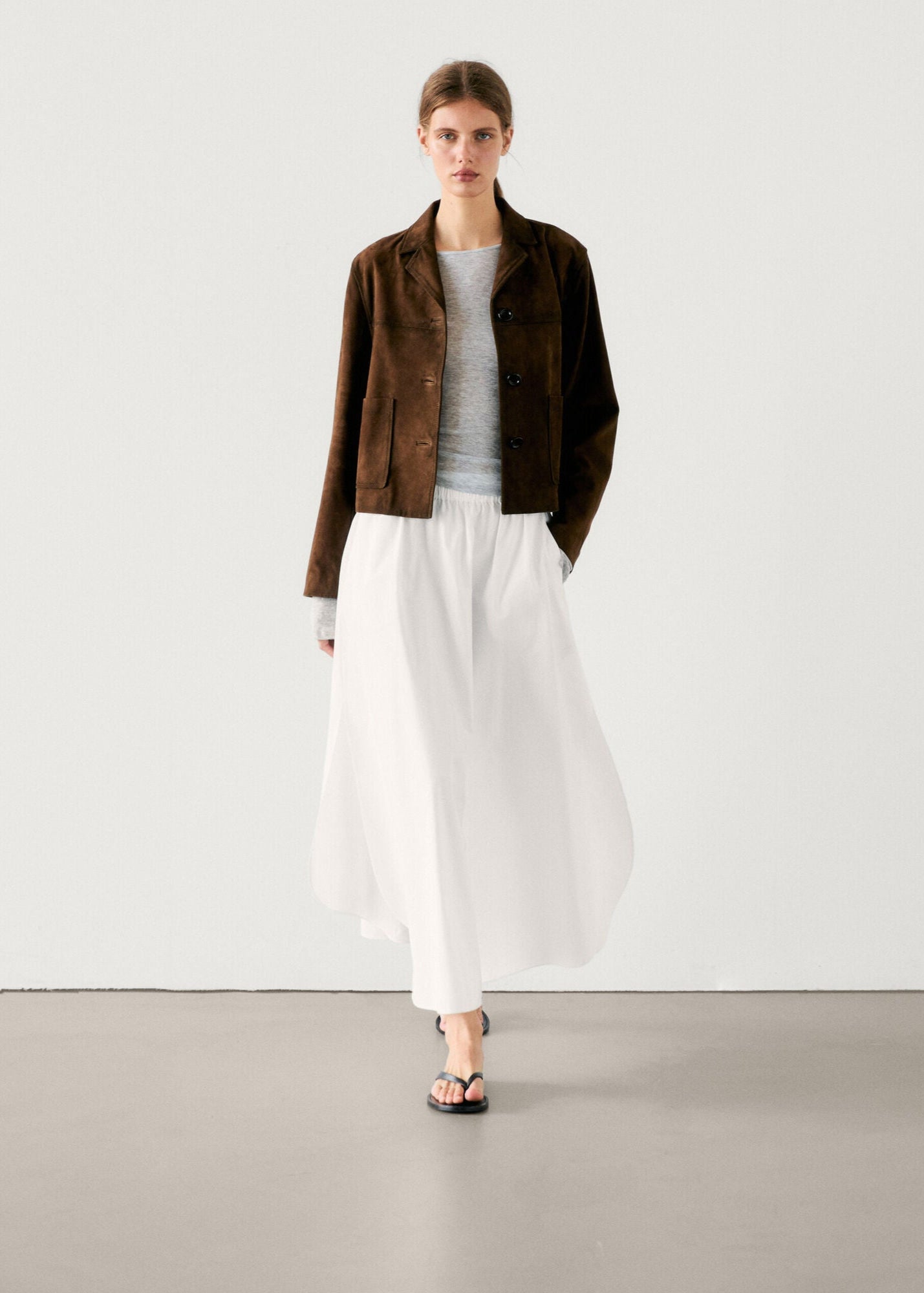 Conçue en daim doux et raffiné, elle offre un toucher velouté et un tombé impeccable. Ses boutons contrastés et ses poches plaquées pratiques apportent une note de caractère tout en préservant une allure chic et soignée.
